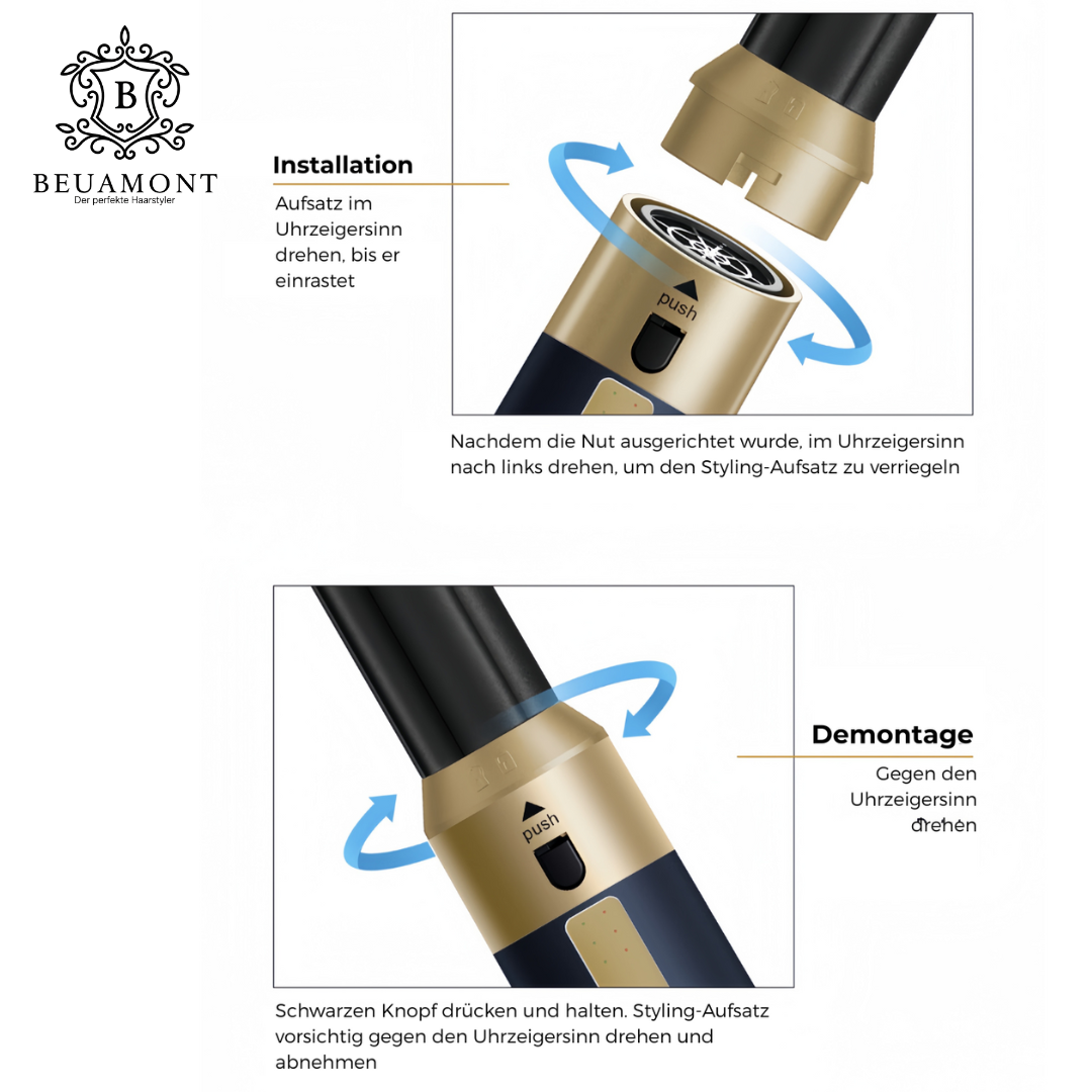 Die Anwendung des Beuamont™ 2.0 ist kinderleicht! Mit nur einem Handgriff kannst du die verschiedenen Aufsätze mühelos wechseln und bist sofort startklar für dein perfektes Styling-Erlebnis. Einfach, unkompliziert und zeitsparend!