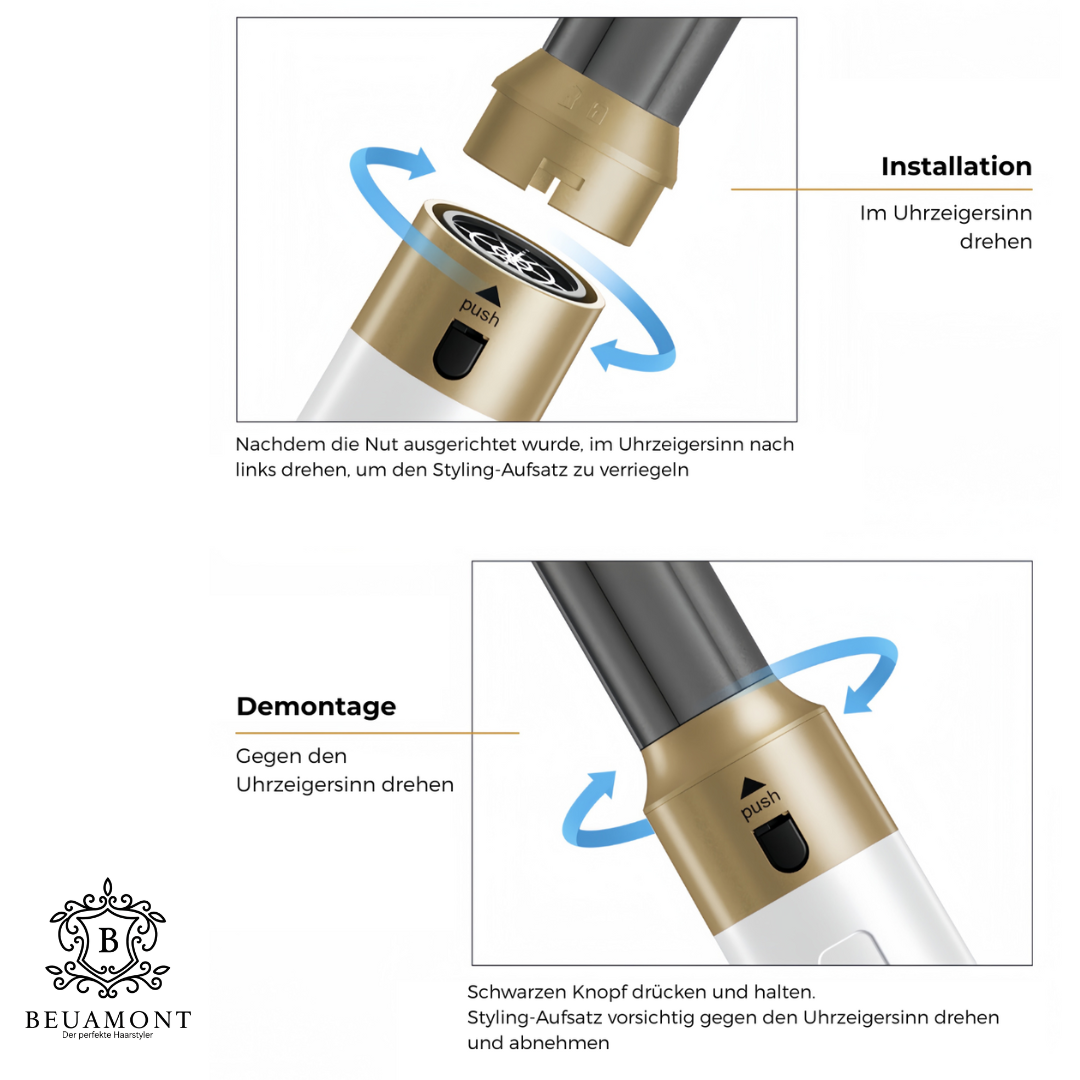 Die Anwendung des Beuamont™ 2.0 ist kinderleicht! Mit nur einem Handgriff kannst du die verschiedenen Aufsätze mühelos wechseln und bist sofort startklar für dein perfektes Styling-Erlebnis. Einfach, unkompliziert und zeitsparend!